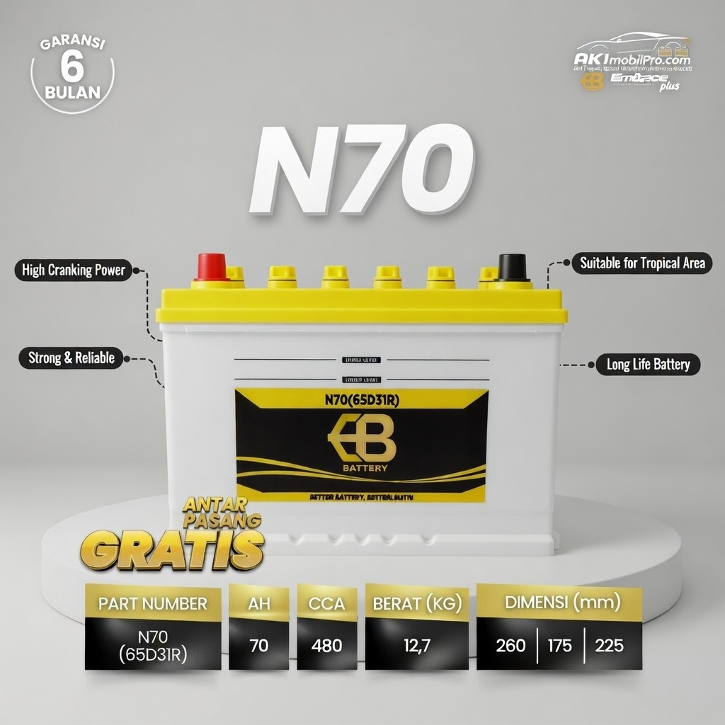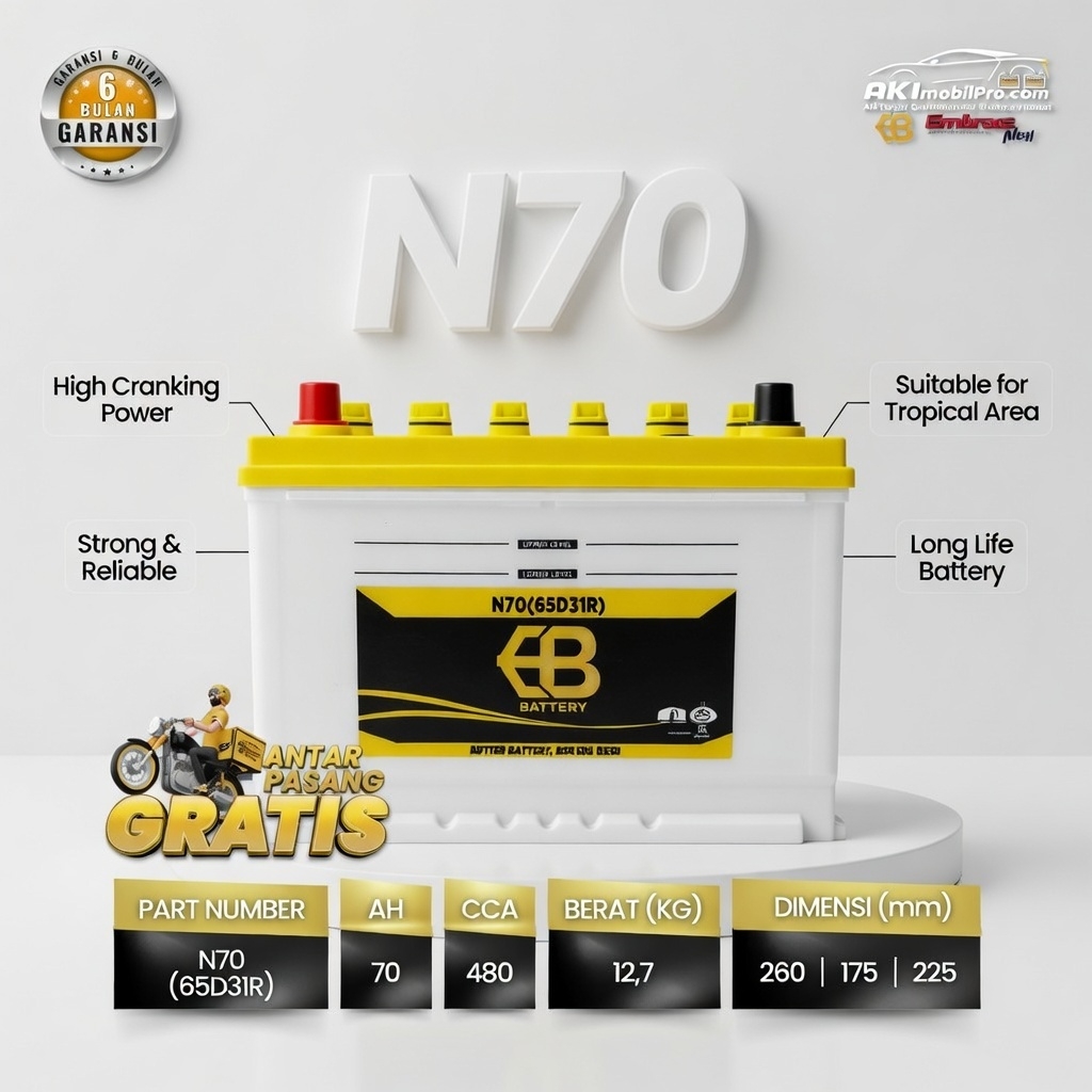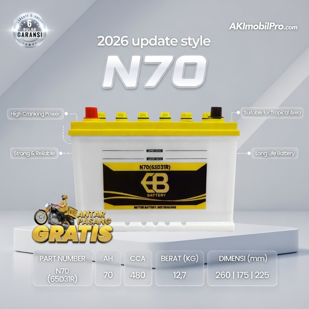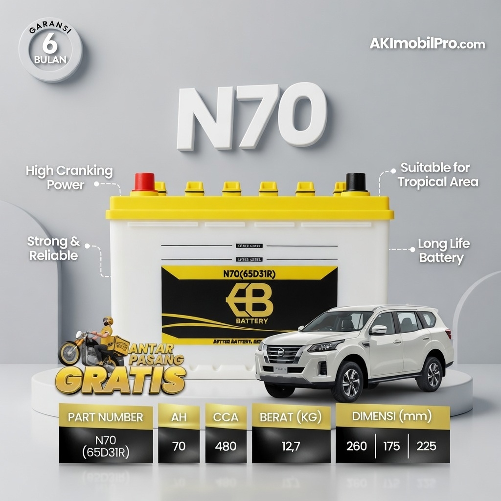 EB Battery N70 (65D31R) adalah solusi daya besar dengan biaya hemat. Dengan kapasitas 70Ah dan CCA 480, aki ini sangat mumpuni untuk memutar mesin diesel kompresi tinggi seperti L300 dan Panther.