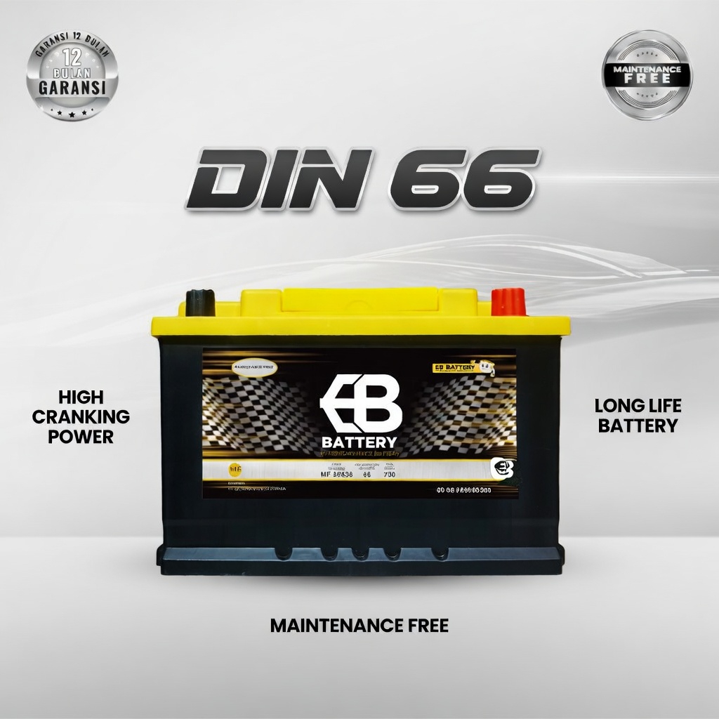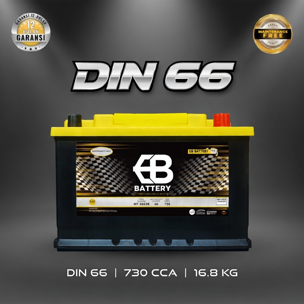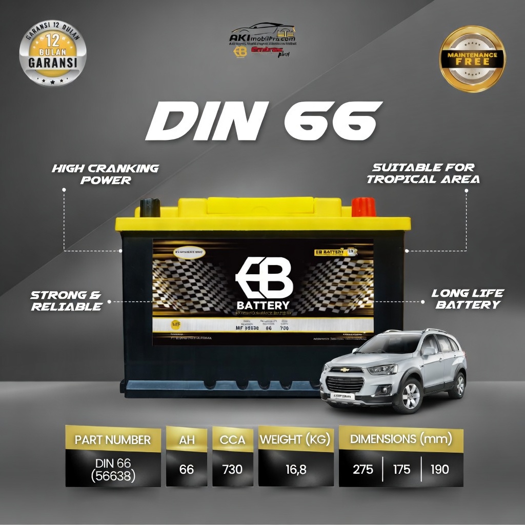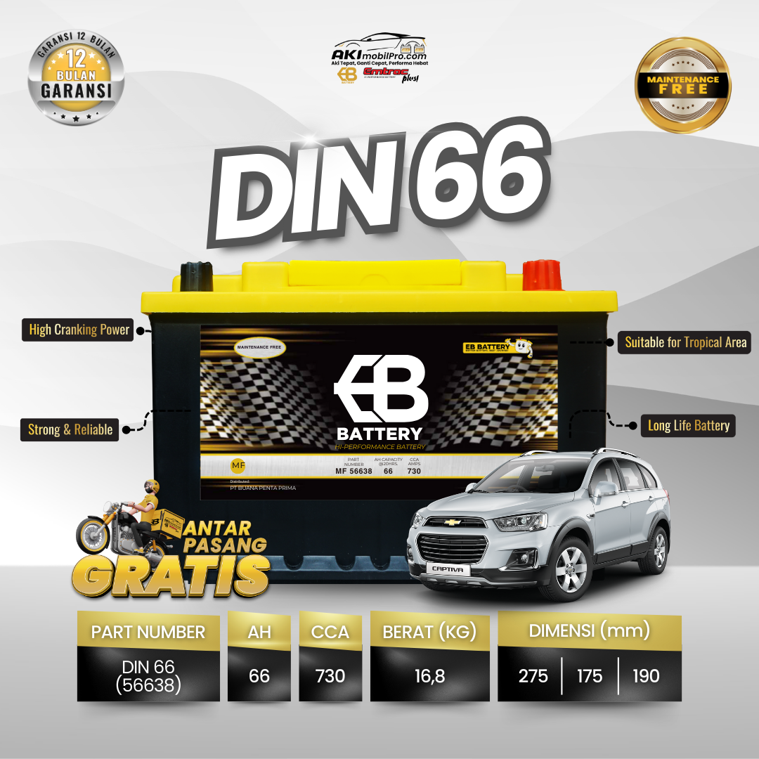Aki Kering EB DIN66 (56638) dirancang khusus untuk memenuhi tingginya kebutuhan daya listrik pada mobil-mobil generasi terbaru. Mobil Eropa dan mobil Asia masa kini telah mengadopsi standar aki DIN (Kutub Tenggelam) berukuran LN3. Posisi terminal aki yang sejajar dengan cover aki ini tidak hanya rapi, tetapi juga diwajibkan oleh standar keselamatan otomotif Eropa untuk menghindari korsleting jika kap mesin mengalami benturan.
