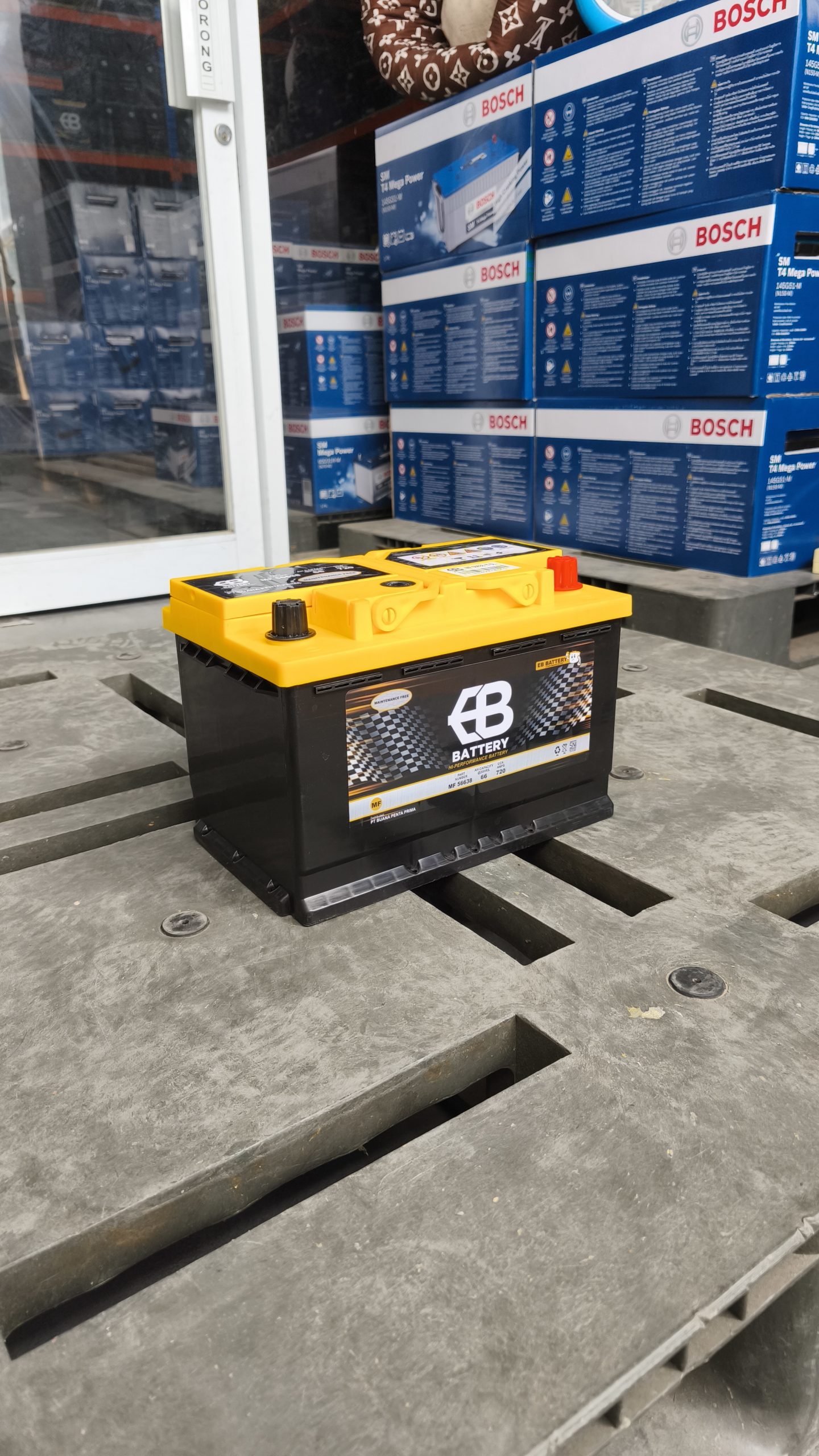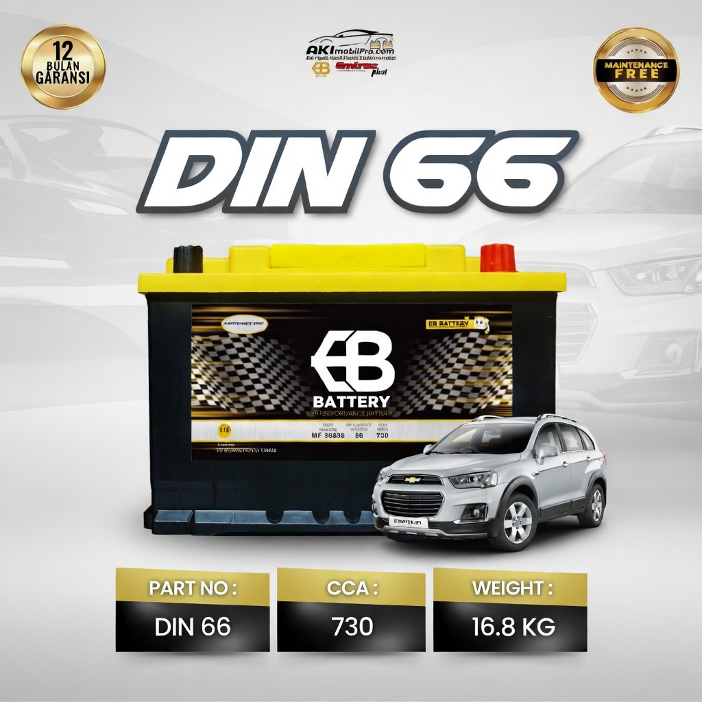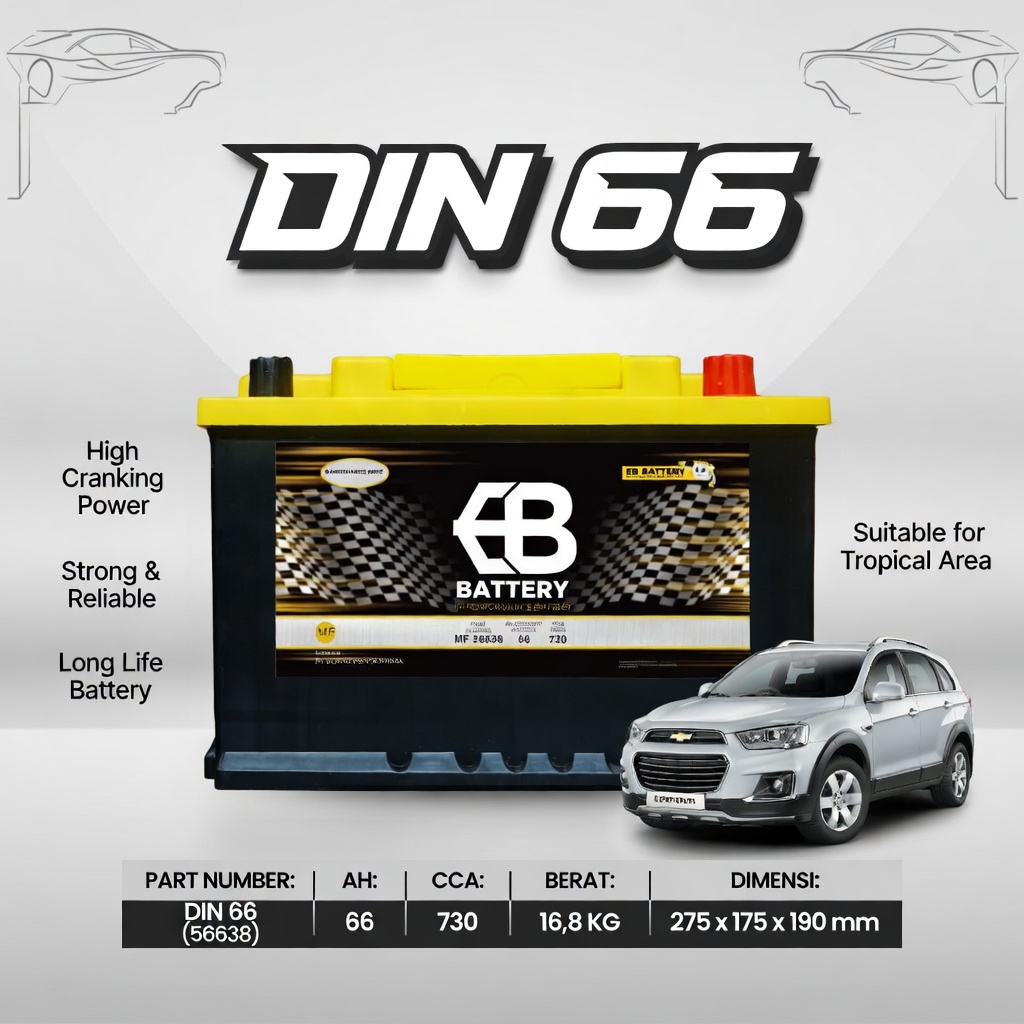 Aki Kering EB DIN66 (56638) dirancang khusus untuk memenuhi tingginya kebutuhan daya listrik pada mobil-mobil generasi terbaru. Mobil Eropa dan mobil Asia masa kini telah mengadopsi standar aki DIN (Kutub Tenggelam) berukuran LN3. Posisi terminal aki yang sejajar dengan cover aki ini tidak hanya rapi, tetapi juga diwajibkan oleh standar keselamatan otomotif Eropa untuk menghindari korsleting jika kap mesin mengalami benturan.