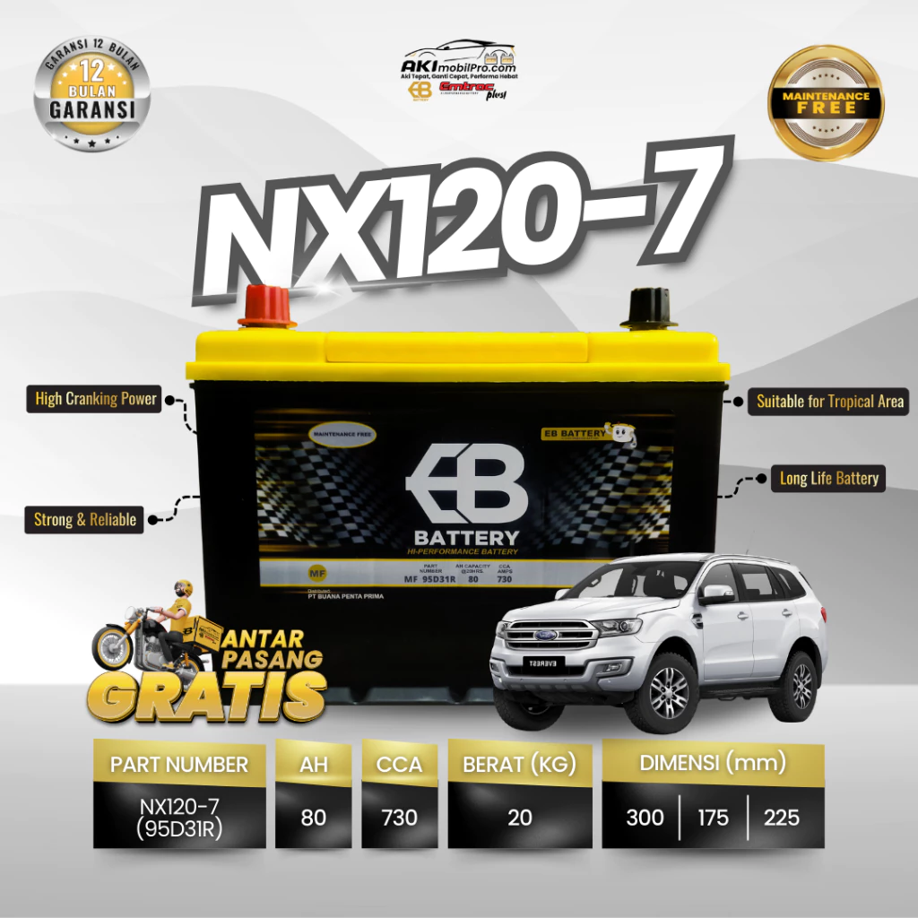 Aki Kering EB NX120-7R (95D31R) hadir untuk menjawab kebutuhan kendaraan diesel yang sering mengalami masalah “Starter Berat”. Di pasaran, aki tipe NX120-7 atau N70Z biasanya memiliki CCA sekitar 500-an dan berat 15-16 Kg. Namun, produk EB Battery ini adalah anomali positif dengan spesifikasi CCA 730 Amps dan berat bersih 20 Kg.